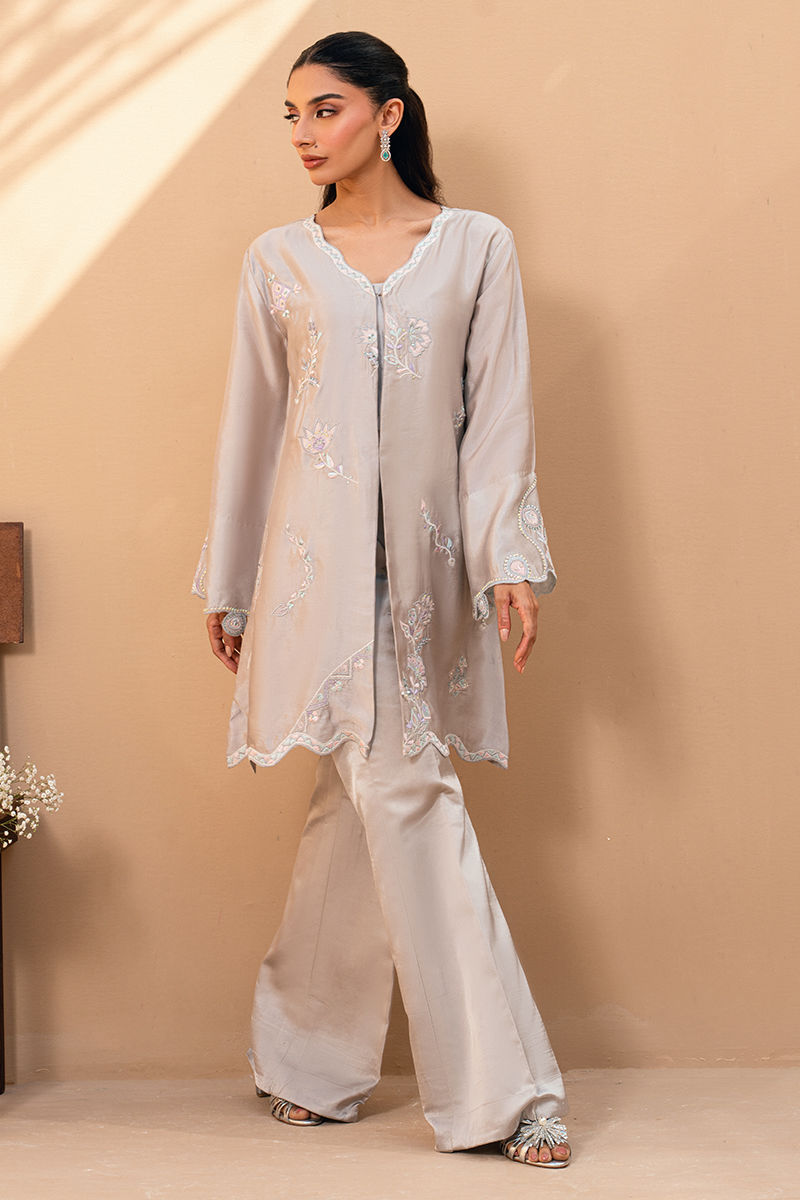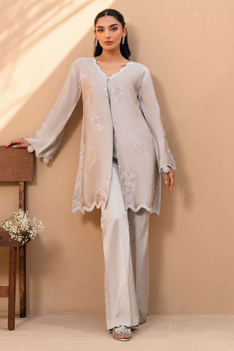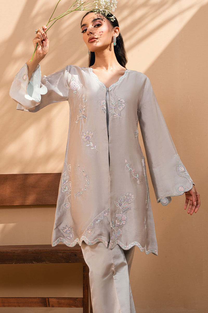 Soft, serene, and effortlessly feminine, this pearl-grey ensemble is a celebration of subtle craftsmanship. The straight-cut shirt is adorned with delicate pastel floral embroidery, complemented by scalloped edges along the hem and sleeves for a gentle, romantic touch. Paired with tailored bell trousers, the look is clean, modern, and timeless. Perfect for daytime festivities or intimate gatherings, this ensemble embodies quiet luxury with floral finesse.