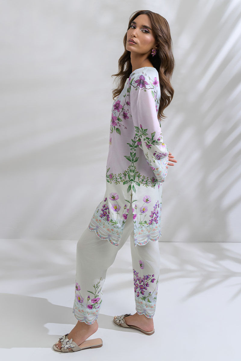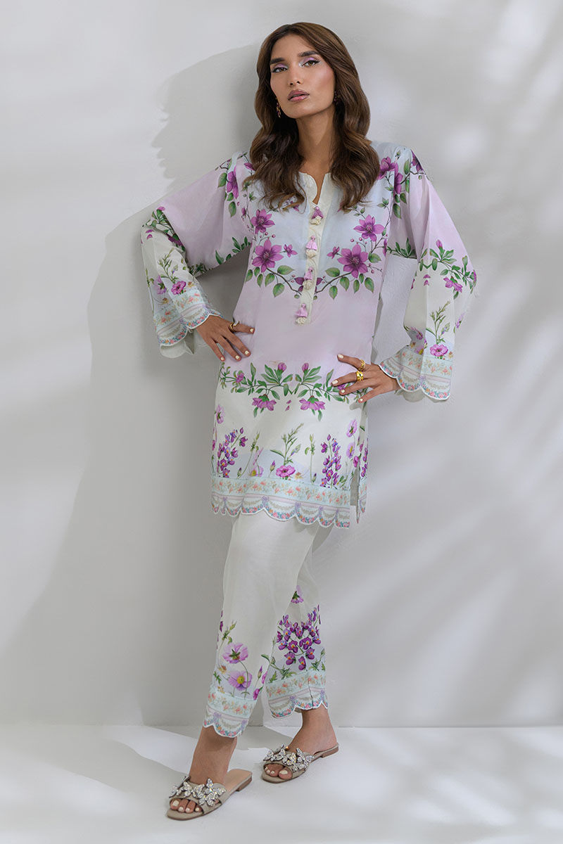 Step into a breezy and airy aesthetic with this Swiss lawn co-ord that features a fresh palette of pastel pink and blue, soft green, and ivory. This a straight cut short kurta with airy, flared sleeves and a scallpoed hemline that adds flow, while the coordinated floral trousers complete the look. Perfect for summer dinners or floral-themed get-togethers.