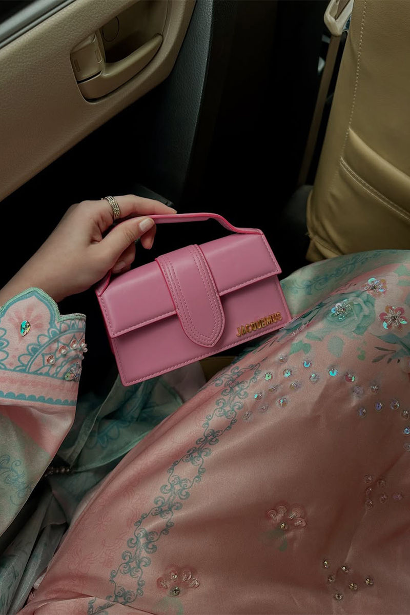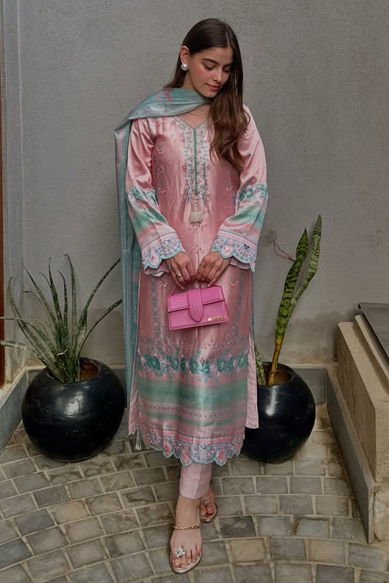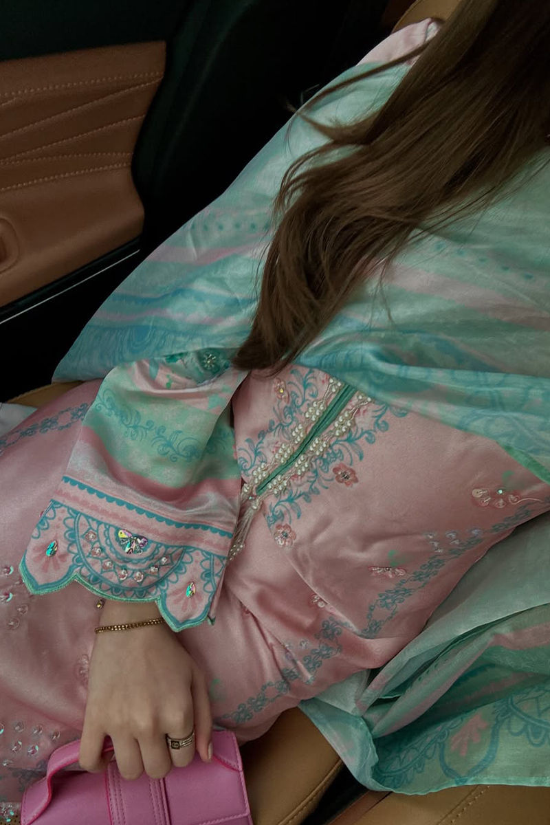 This gorgeous articles features a silk digital printed peach a-line shirt with mint floral motifs with an embellished neckline, daaman and panels all finished with cutwork borders and paired with an peach pant and a similarly printed medium silk dupatta with heavy tassels