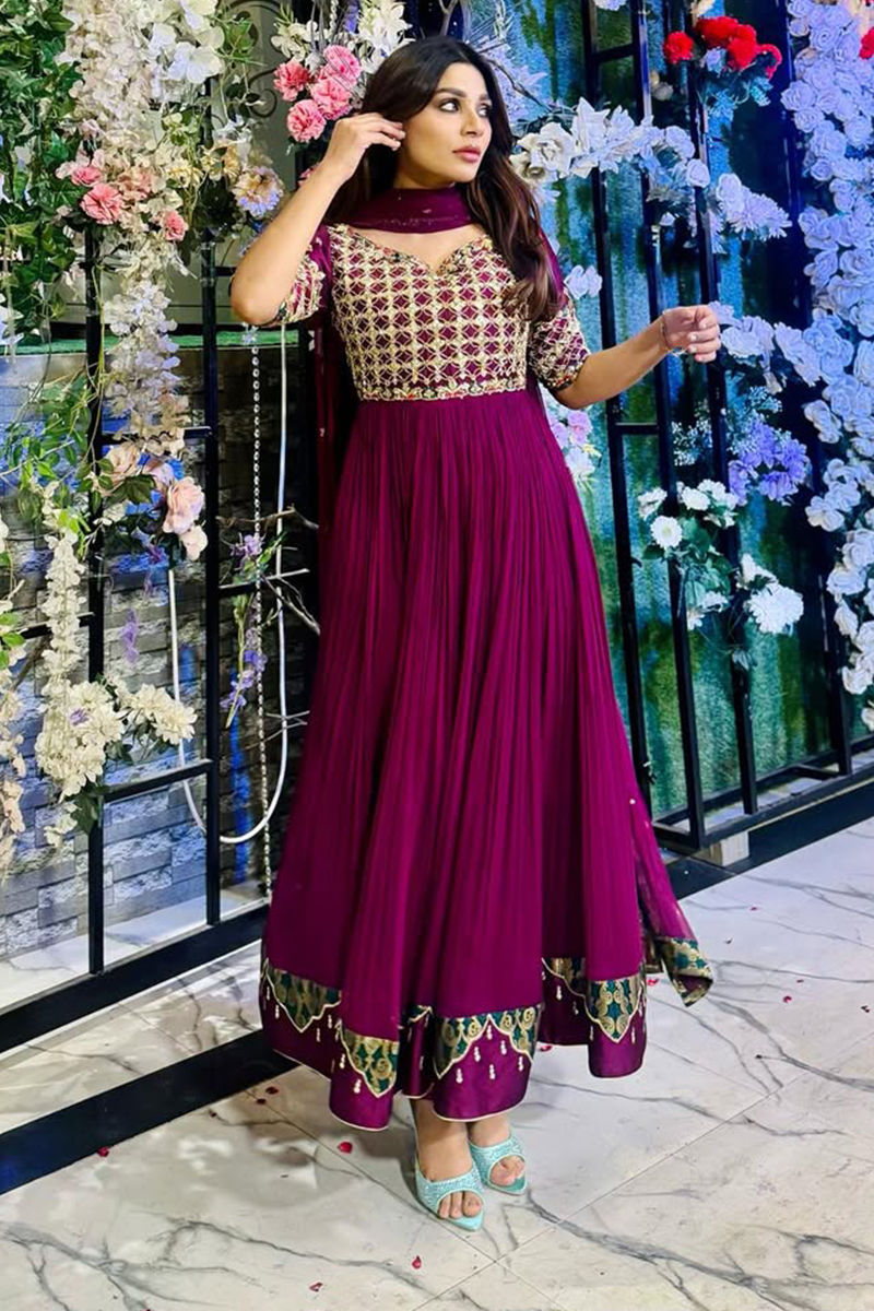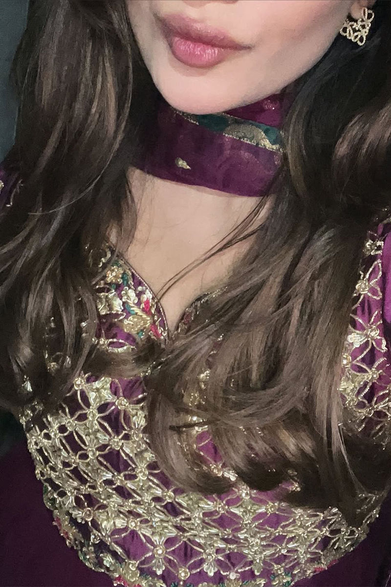 An enchanting plum-toned kalidar with a heavily embellished bodice in resham, zari, and sequins forming geometric floral patterns. The flowing panels are kept minimal with delicate scattered motifs, finished with an Embroidered border in deep green and gold. Paired with a matching dupatta and straight pants, this ensemble strikes the perfect balance of opulence and sophistication—ideal for receptions, formal dinners, and festive soirées.