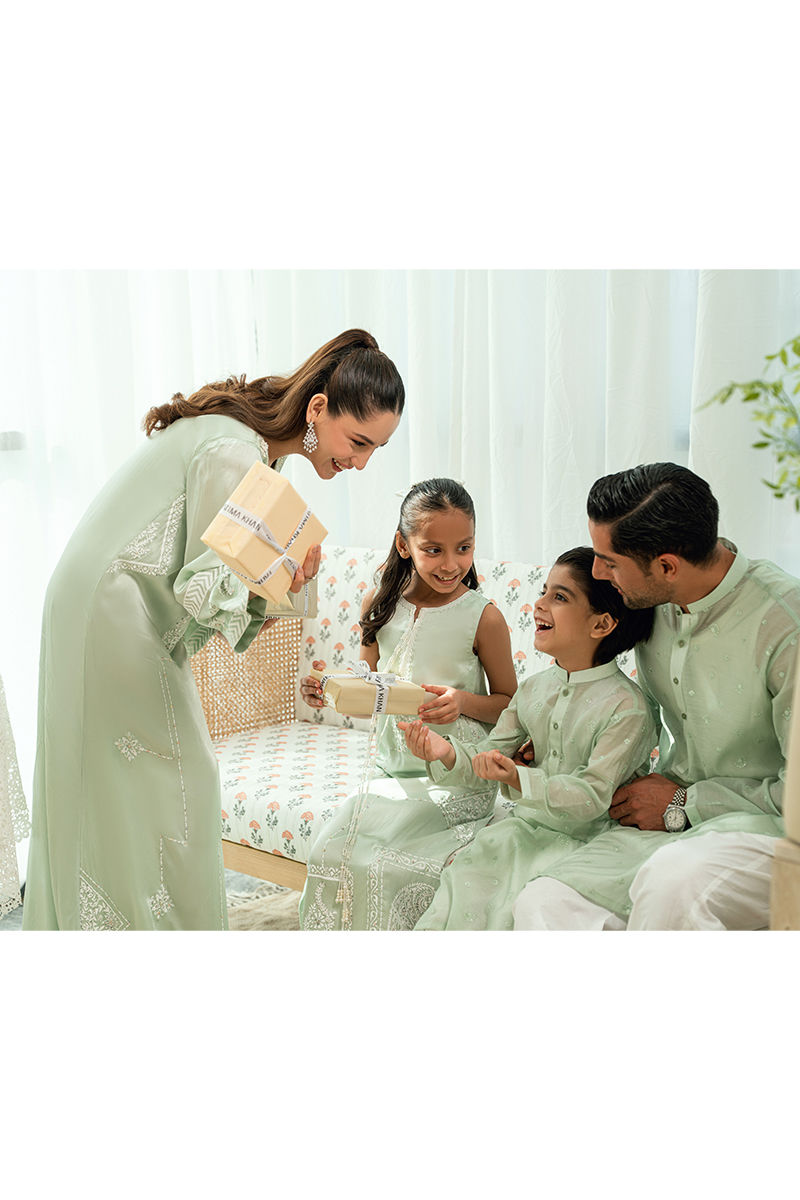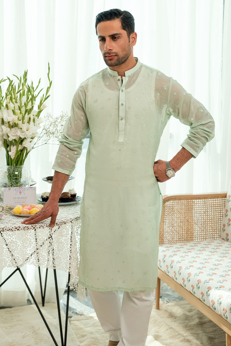 A statement mint kurta crafted on a sheer, lightweight fabric, delicately adorned with subtle hand-embellished motifs. The modern silhouette and refined detailing create a fresh festive look that feels both contemporary and traditional. Styled with white shalwar, this kurta is ideal for Eid celebrations and summer festivities.