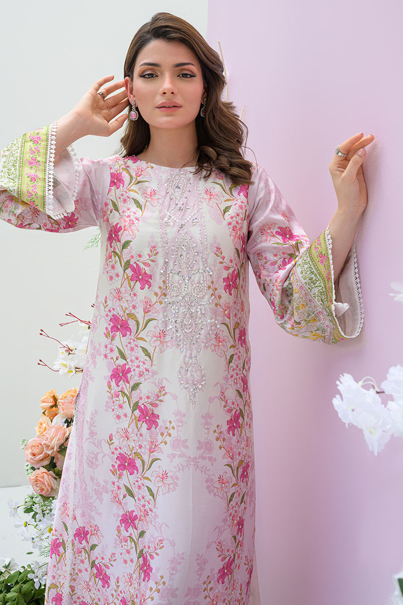 Embrace timeless elegance with Rose Reverie. This ensemble features an ivory and pink digital-printed long shirt, adorned with an embellished neckline and delicate floral accents. Intricate embroidery and lace detailing grace the sleeves, adding a touch of sophistication. Paired with cotton silk straight pants and a gradient cotton silk dupatta, this outfit exudes refined charm and graceful allure. The max length for this shirt is 45 - 46 inches
