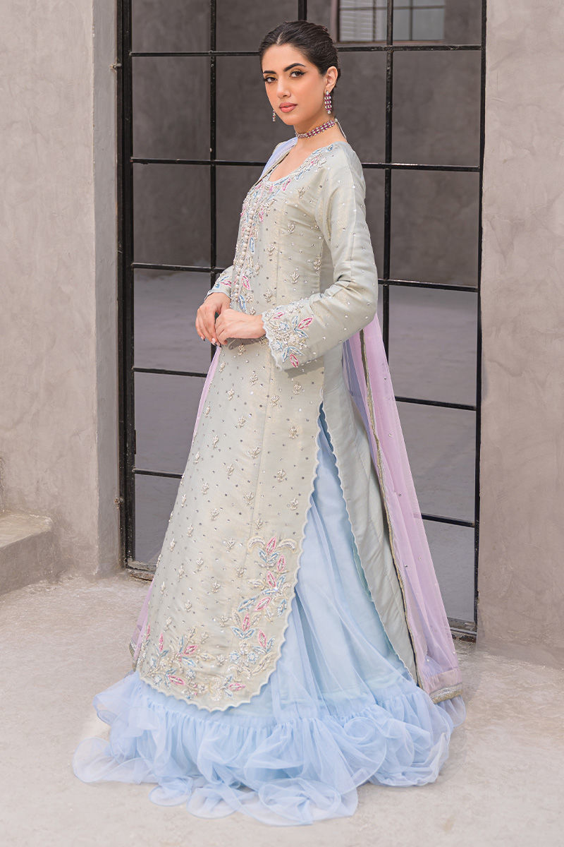 A dreamy powder blue long kameez adorned with delicate pastel embroidery and crystal embellishments, paired with a lilac net dupatta. The outfit is finished with soft ruffled organza edging at the hem, adding movement and charm. Light, ethereal, and graceful, this ensemble is an enchanting choice for day weddings, engagement ceremonies, or elegant