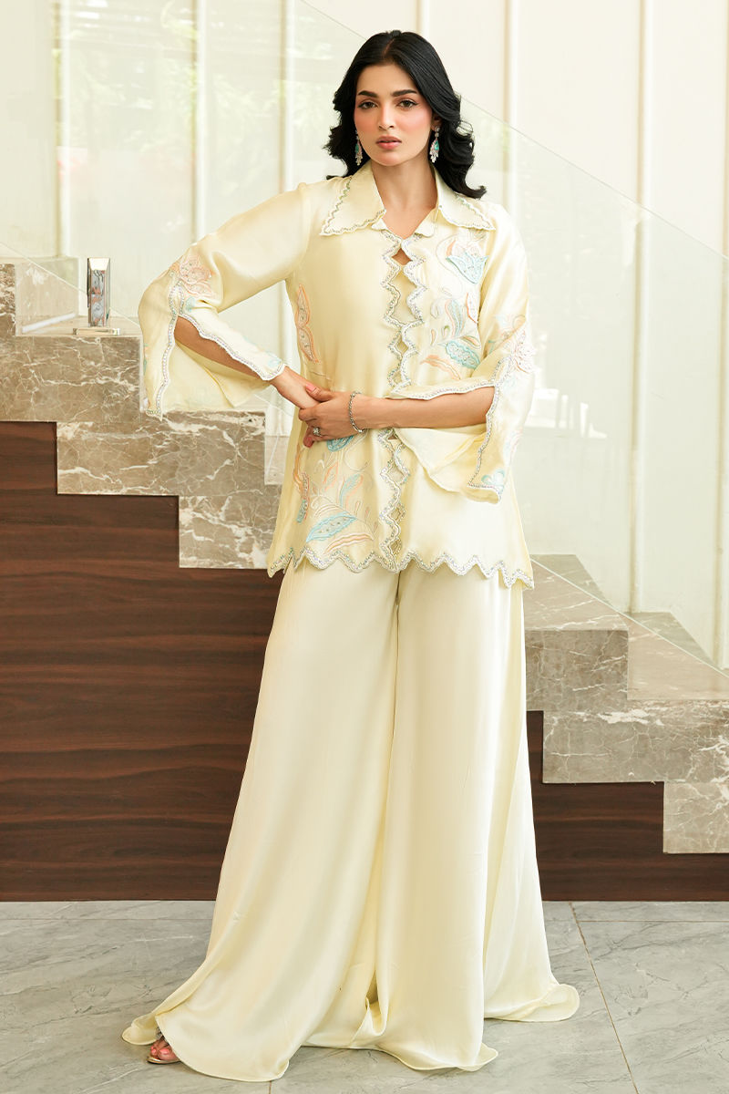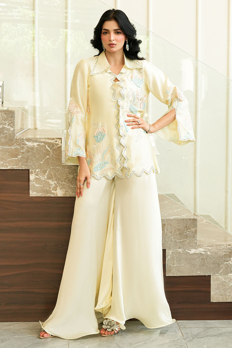 A refreshing pastel yellow mommy and me ensemble adorned with delicate floral embroidery in soft blue and blush hues, elevated with intricate scalloped detailing. Paired with fluid wide-leg trousers, the silhouette flows with graceful ease balancing effortless sophistication with a touch of playful charm.