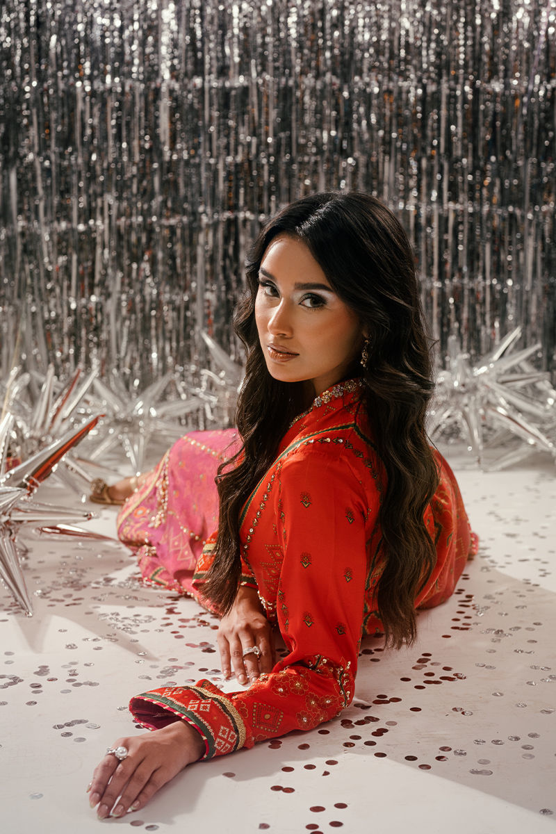 A radiant expression of color and craftsmanship, Sunlit Umber brings together shades of burnt orange and magenta in a mesmerizing digital print that reflects warmth and vibrance. The long shirt features a contemporary composition with refined detailing, exuding effortless sophistication and modern grace. Paired with coordinated trousers and a matching digitally printed dupatta, the ensemble creates a harmonious balance of tone and texture—capturing the glow of twilight hues in motion. Elegant, timeless, and undeniably captivating, Sunlit Umber celebrates confident femininity through color, flow, and finesse.
