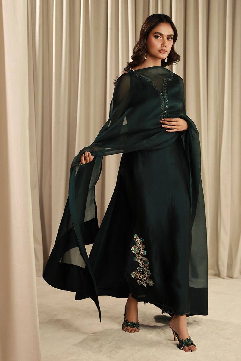 This article features an emerald green mirror silk sleeveless shirt with carefully placed embellished and scalloped edges finished with simple pants and an organza dupatta.