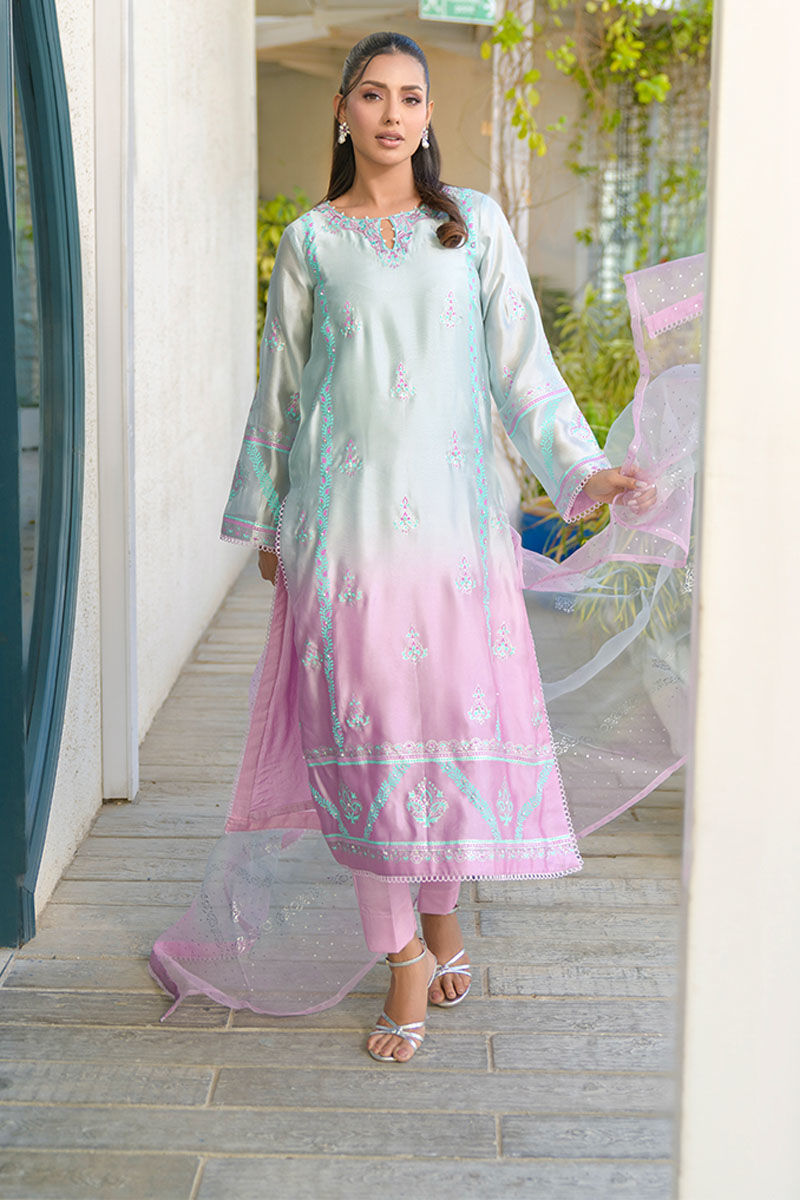 This article features a blue-purple ombre long shirt with block print and embellishments and an embroidered neckline and lace details all finished with cotton silk straight pants and an ombre pure organza dupatta.