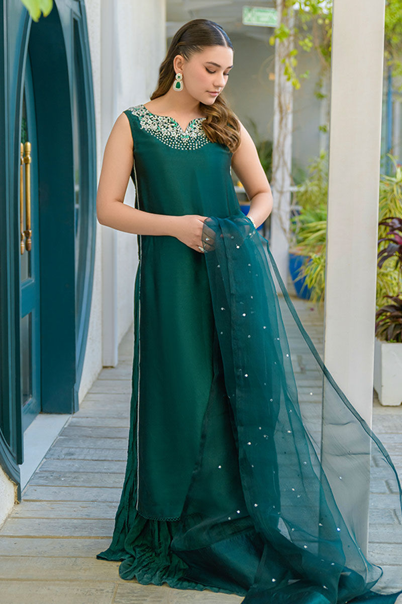This modern article features a pure sheesha silk long shirt in emerald green with a silver embroidered and embellished neckline and silver lace details all finished with a cotton silk crushed pant and an embellished pure organza dupatta.