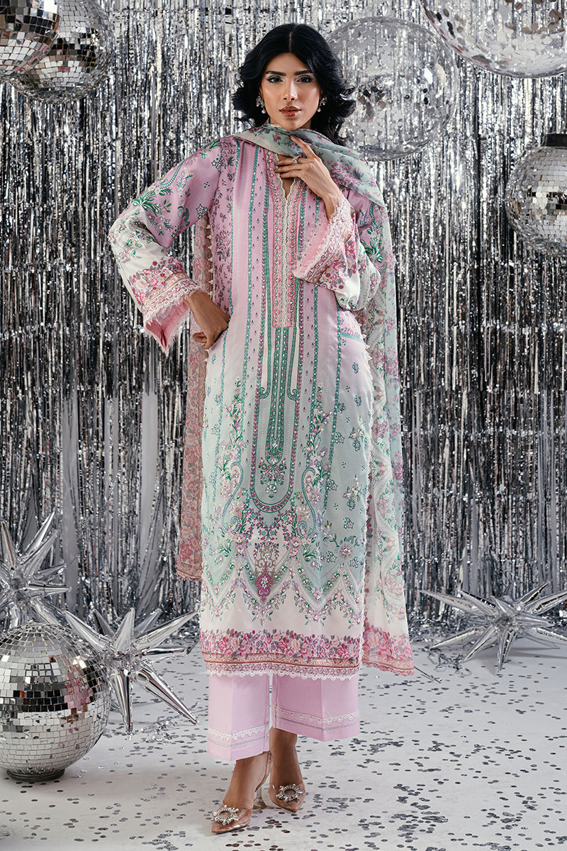 Soft yet striking, Mint Blush Harmony blends two serene shades—mint and light pink—into a delicate composition of elegance. The shirt features intricate handwork and embellishments, paired with a tailored trouser and a digital print dupatta that completes the look with a touch of artistry and refinement.