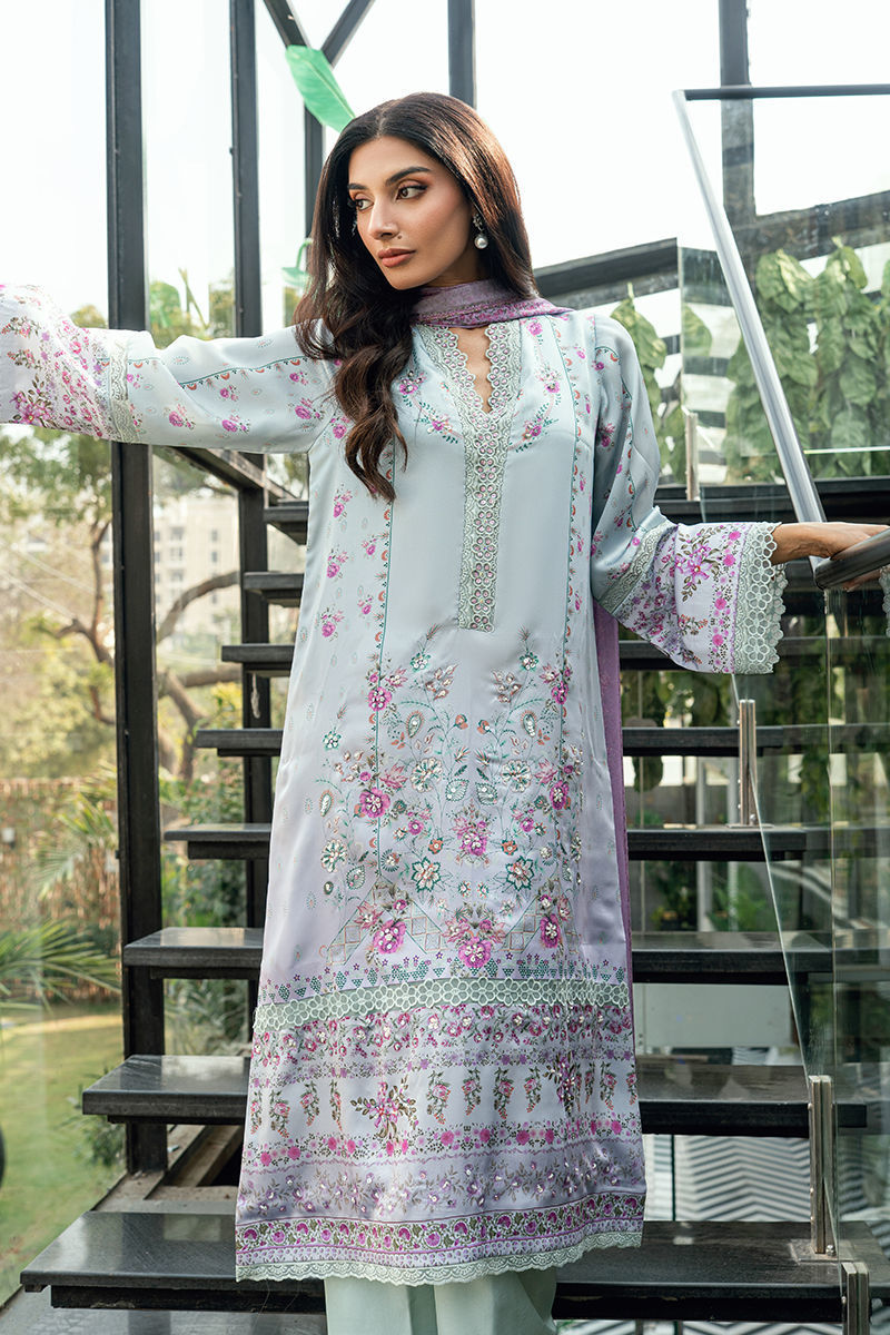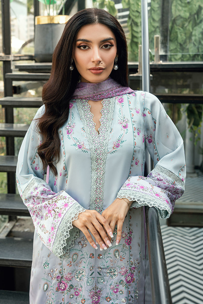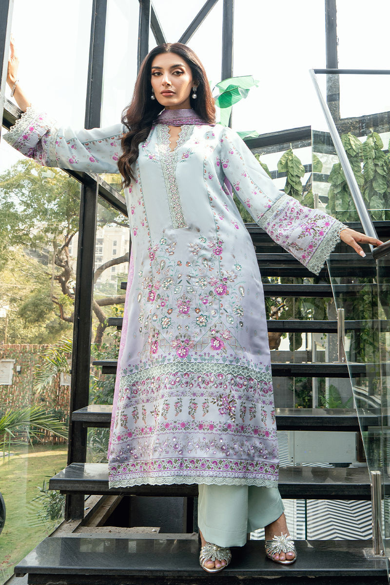 This elegant long shirt is crafted on a refreshing powder blue base, adorned with delicate digital floral prints in shades of blush pink, lilac, lavender, soft rose, mint green, and ivory. The soothing pastel palette creates a graceful and festive appeal, perfect for daytime celebrations. The neckline is beautifully highlighted with intricate embroidery and subtle embellishments, adding refined sparkle without overwhelming the design. Lace detailing on the sleeves and daman enhances the feminine silhouette, while the thoughtfully placed floral borders bring balance and depth. The look is completed with a coordinated dusty-lilac dupatta and matching trousers, offering a polished, harmonious finish. Designed for comfort and elegance, this outfit is ideal for Eid gatherings, iftar dinners, festive lunches, and semi-formal occasions, where understated luxury is key. Product Highlights • Long shirt silhouette with graceful fall • Color palette: powder blue, blush pink, lilac, lavender, mint green & ivory • High-definition digital floral print • Embroidered and embellished neckline • Lace detailing on sleeves and daman • Matching dupatta and trousers • Lightweight, breathable, and festive-ready A timeless festive essential for women who love soft colors, fine detailing, and effortless elegance.