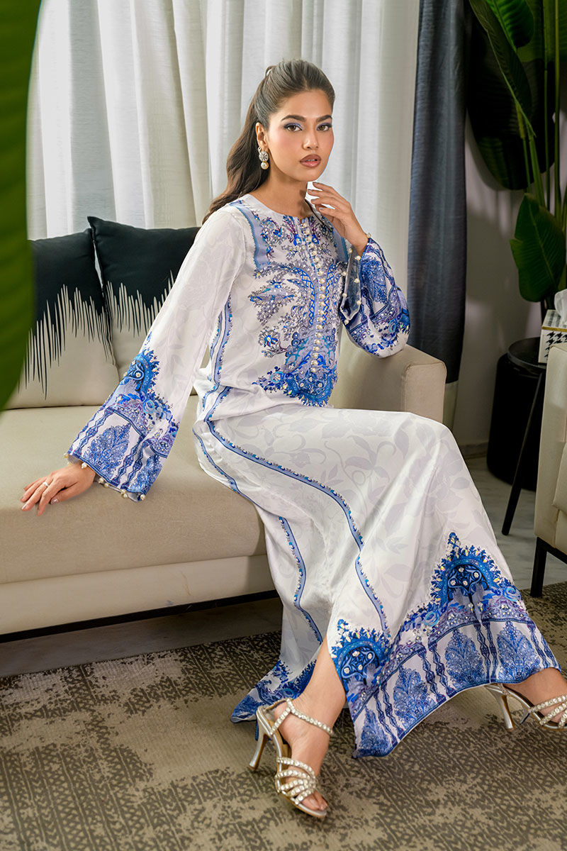 This modern article features a white and blue printed floor length kaftan with long flared sleeves and an embroidered and embellished neckline and sleeves all finished with pearl details.