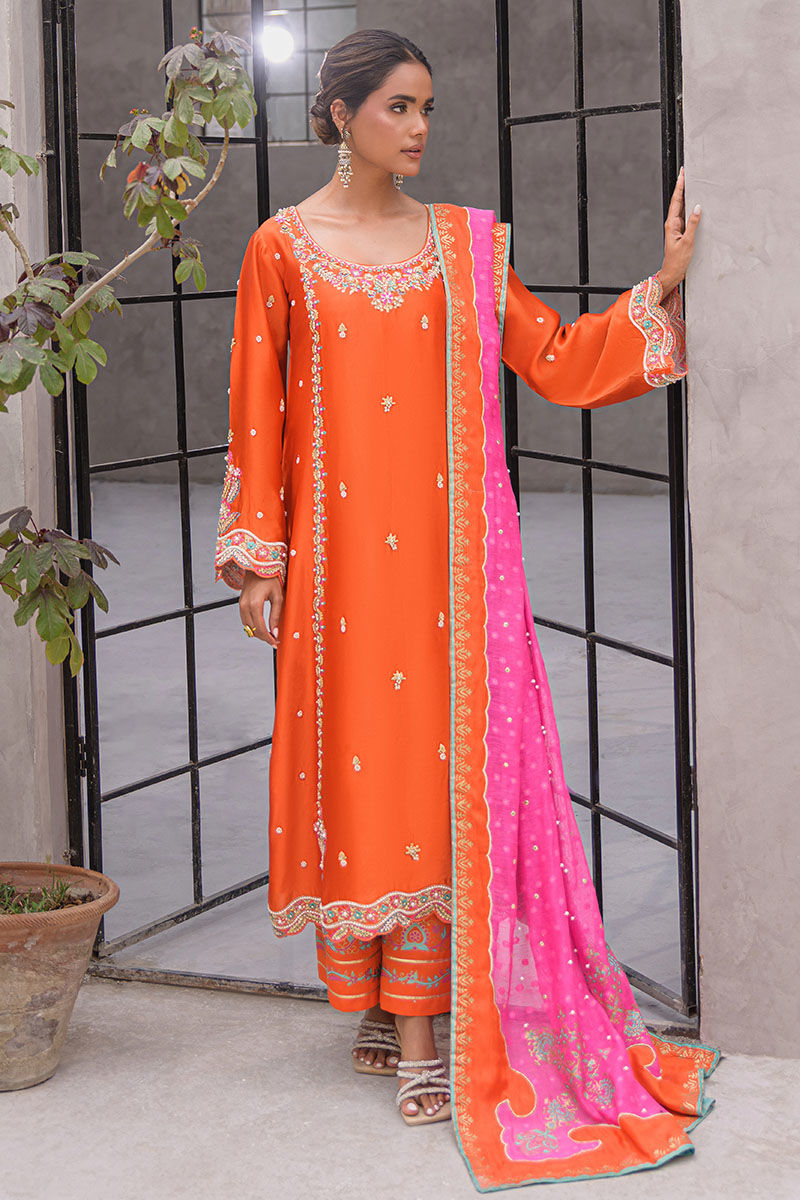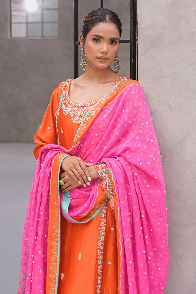 A vibrant burnt orange straight kameez, exquisitely detailed with silver and resham embroidery along the neckline, sleeves, and hemline. The look is elevated with a striking contrast dupatta in fuchsia pink and orange hues, adorned with delicate motifs and finished with a fine green edging. This ensemble is a celebration of festive charm, blending tradition with modern vibrance—perfect for mehndi festivities, dholkis, or day weddings