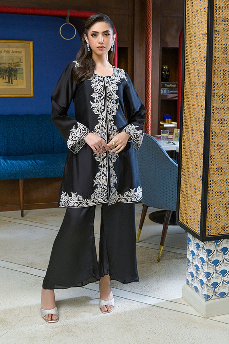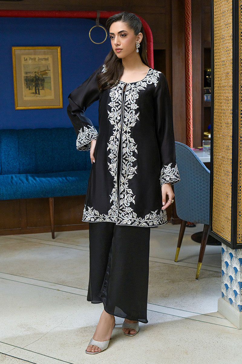This Black and white article features a sheesha silk front open coat with fully embroidered and embellished neckline, front panels, daaman and sleeves all paired with high-lo silk flared pants and a matching slip.