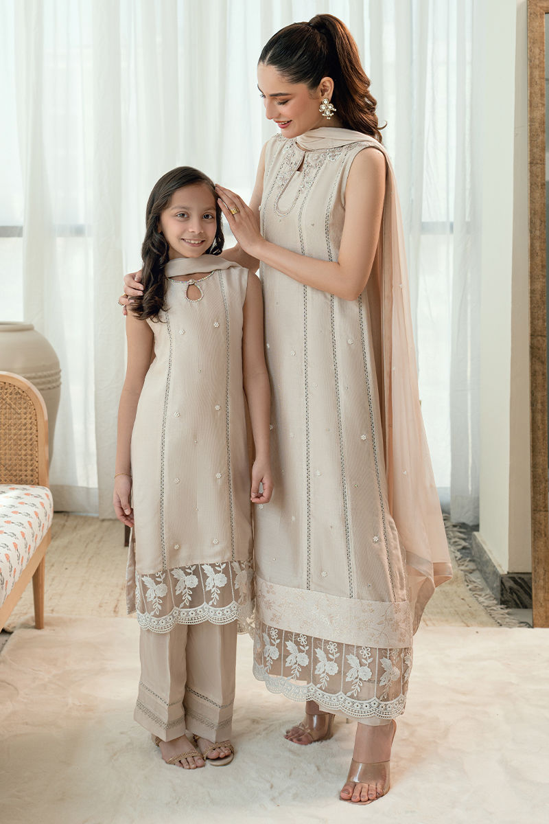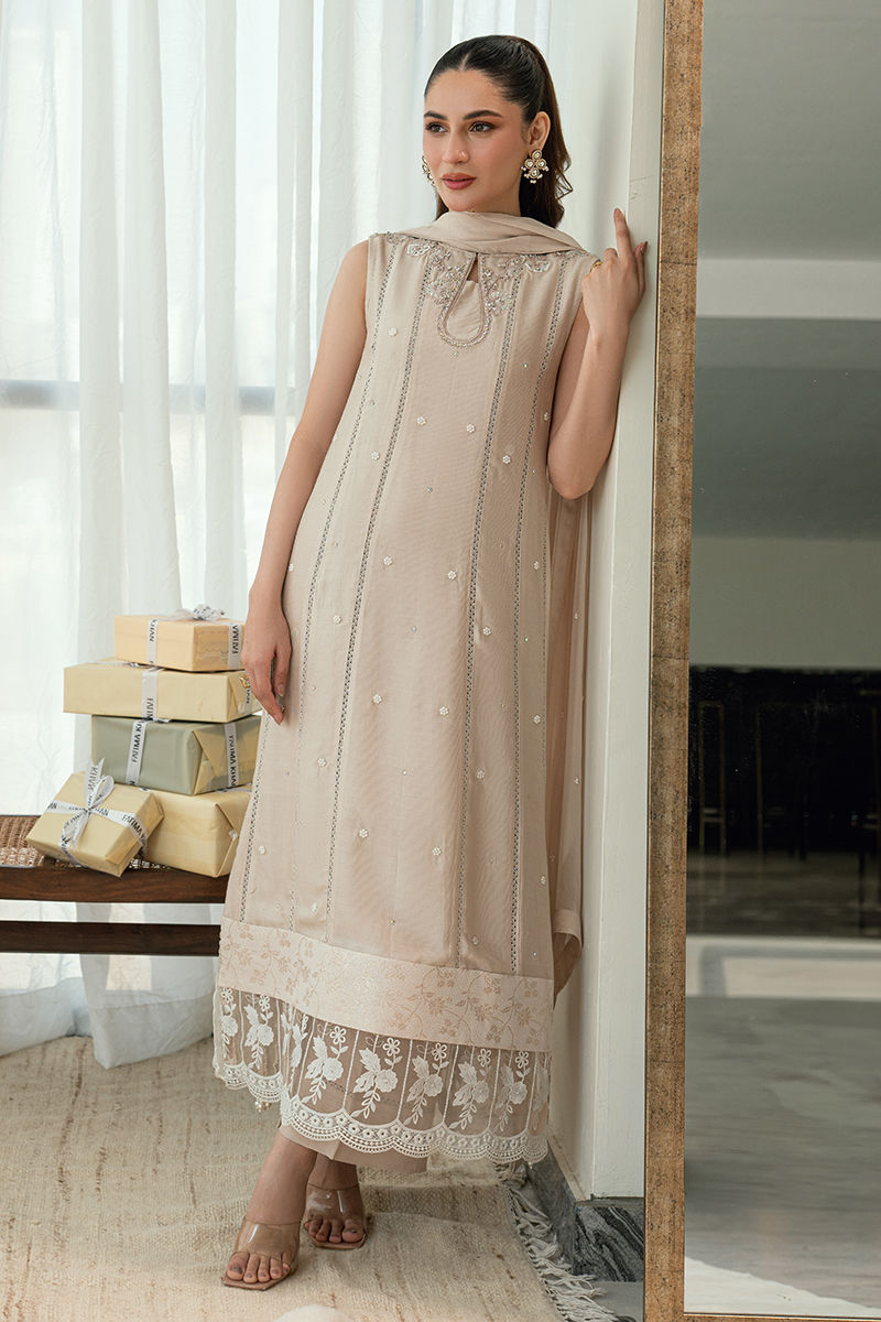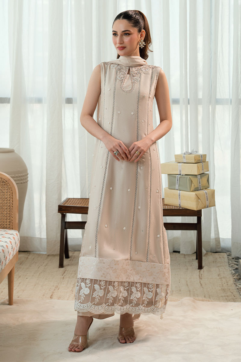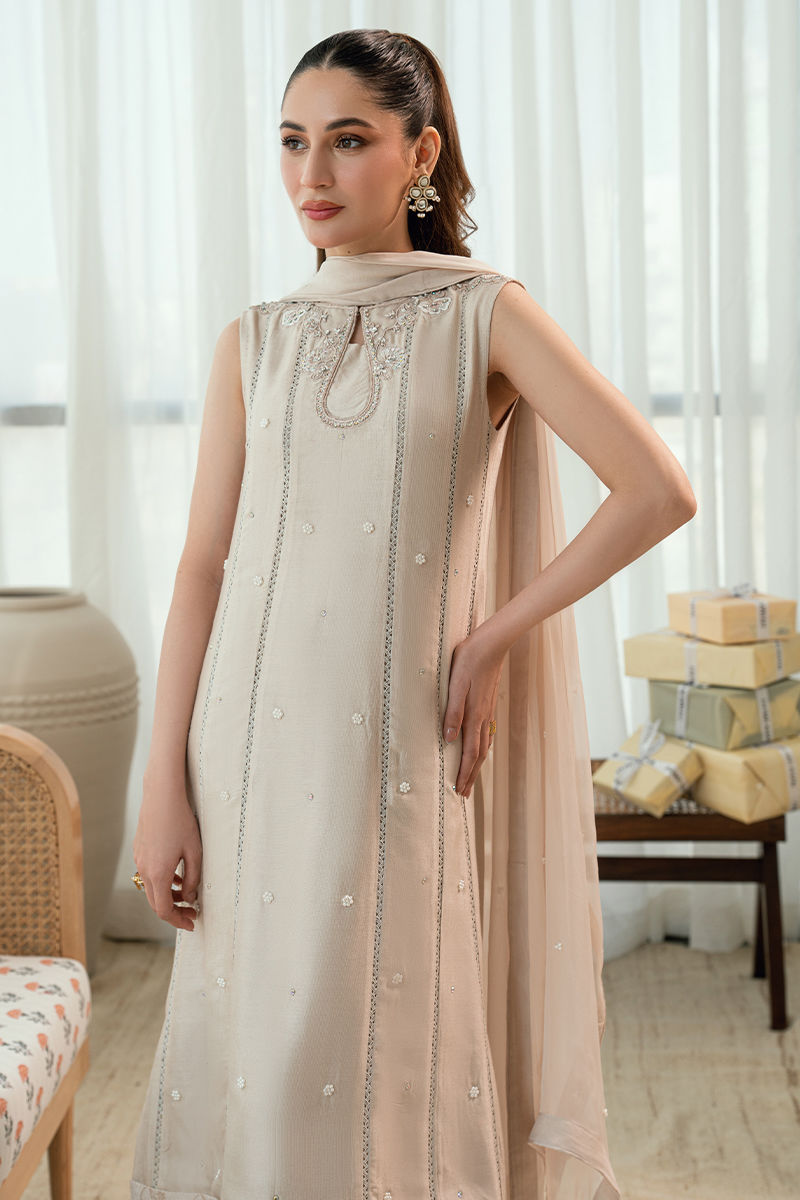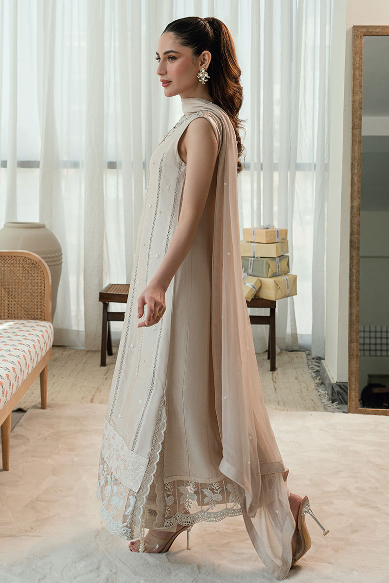 A graceful ivory long shirt crafted on a sheer, fluid base, delicately adorned with hand-placed pearl accents and refined embroidery running through the panels. The neckline features subtle detailing that adds quiet sophistication, while the hem is finished with intricate lace for a soft, feminine touch. Paired with tonal straight pants and a matching dupatta, Zaria is an effortless choice for daytime festivities, intimate gatherings, or elegant Eid wear.