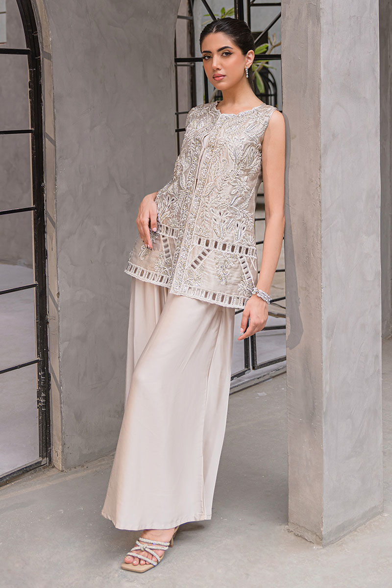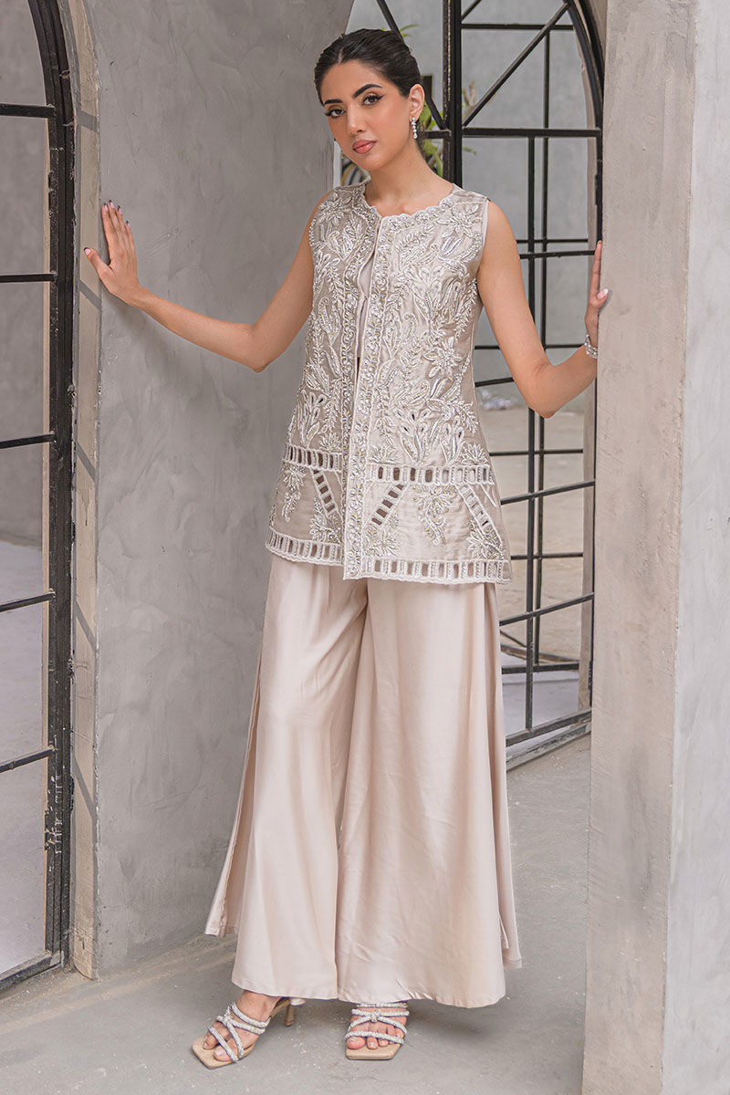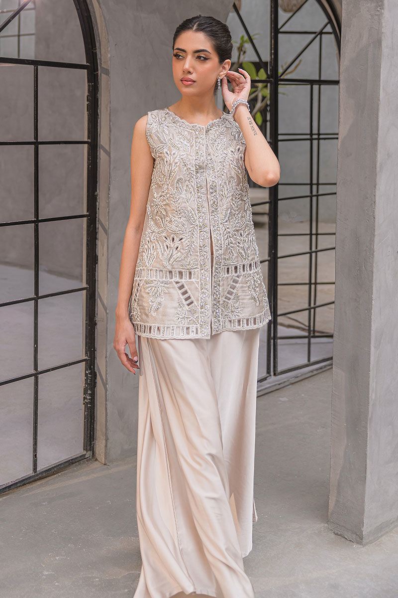 A contemporary ivory-beige ensemble that fuses modern elegance with traditional craftsmanship. The sleeveless jacket is intricately handembellished with silver sequins, crystals, and threadwork, styled over widelegged silk trousers for a sleek silhouette. Minimal yet regal, this outfit is a versatile choice for evening soirées, engagement parties, or as a refined festive look.