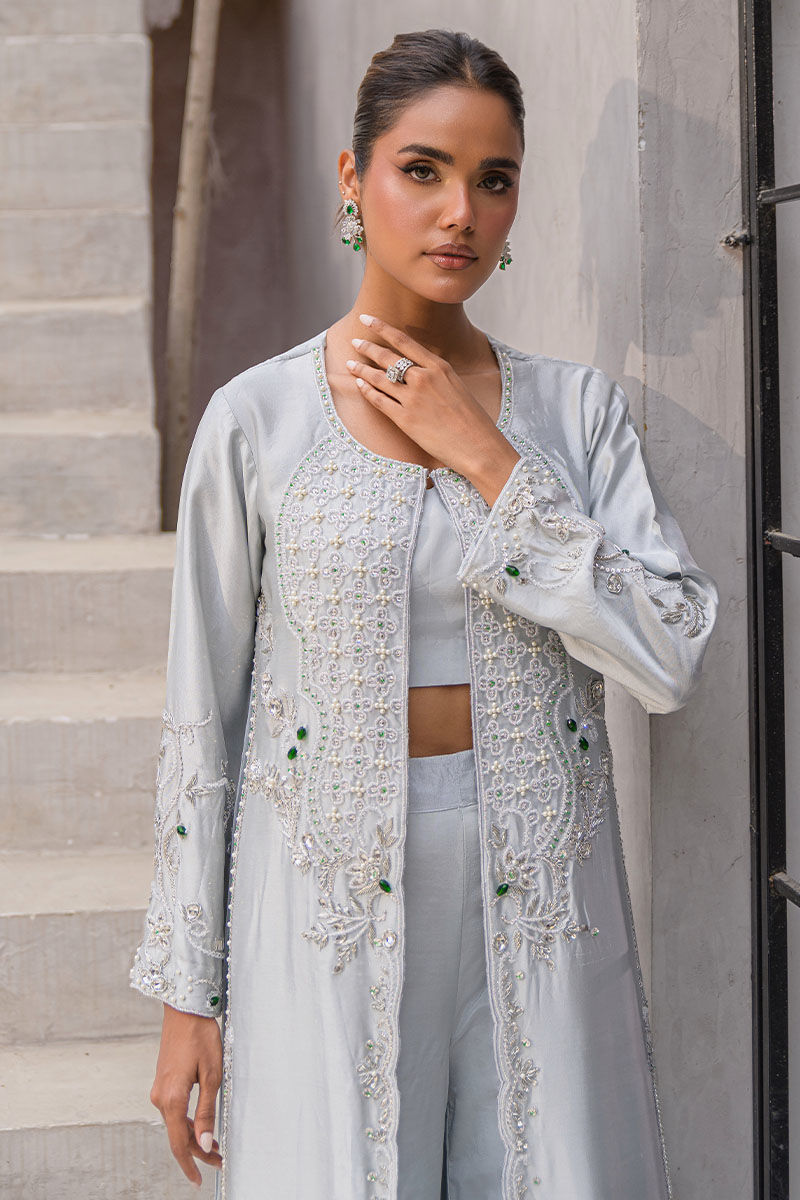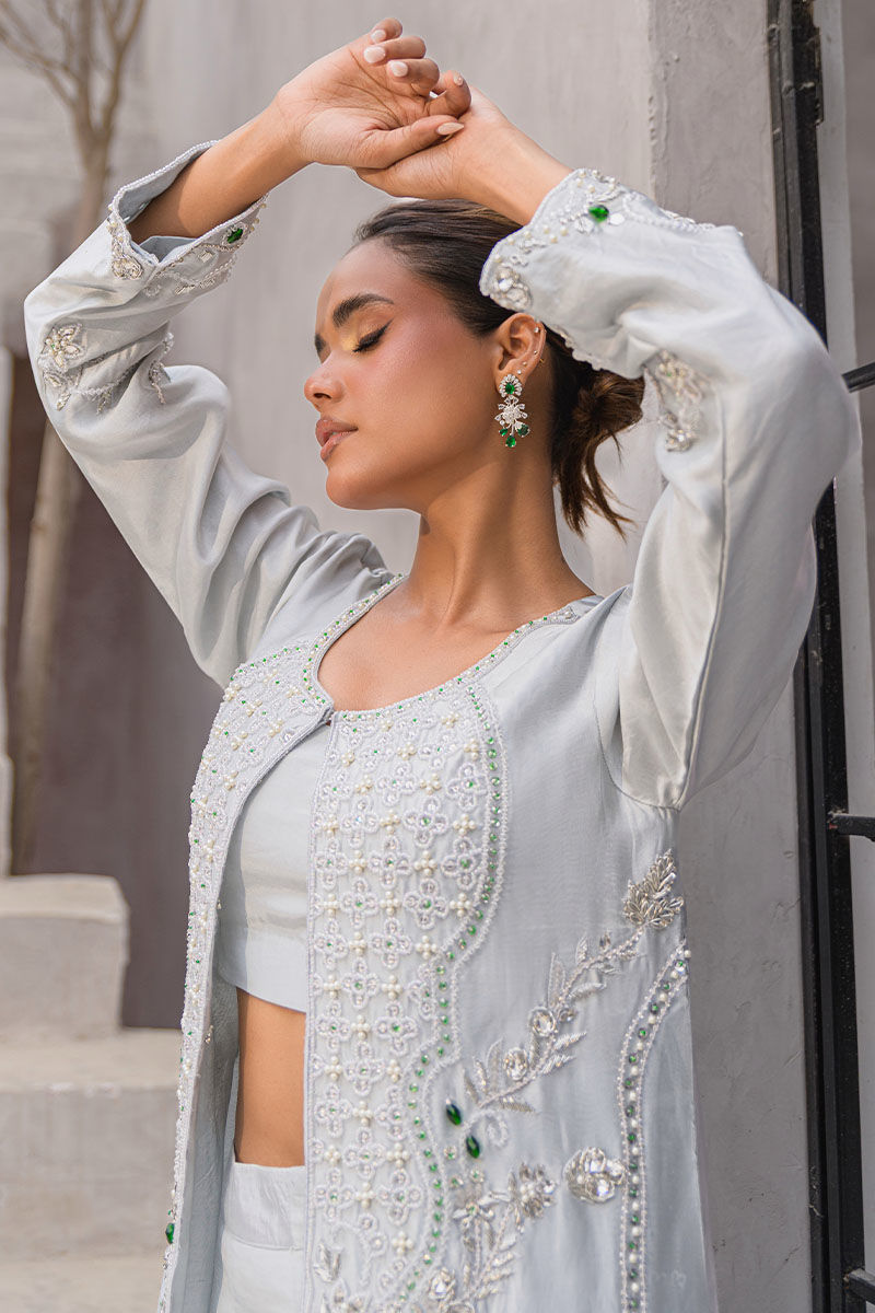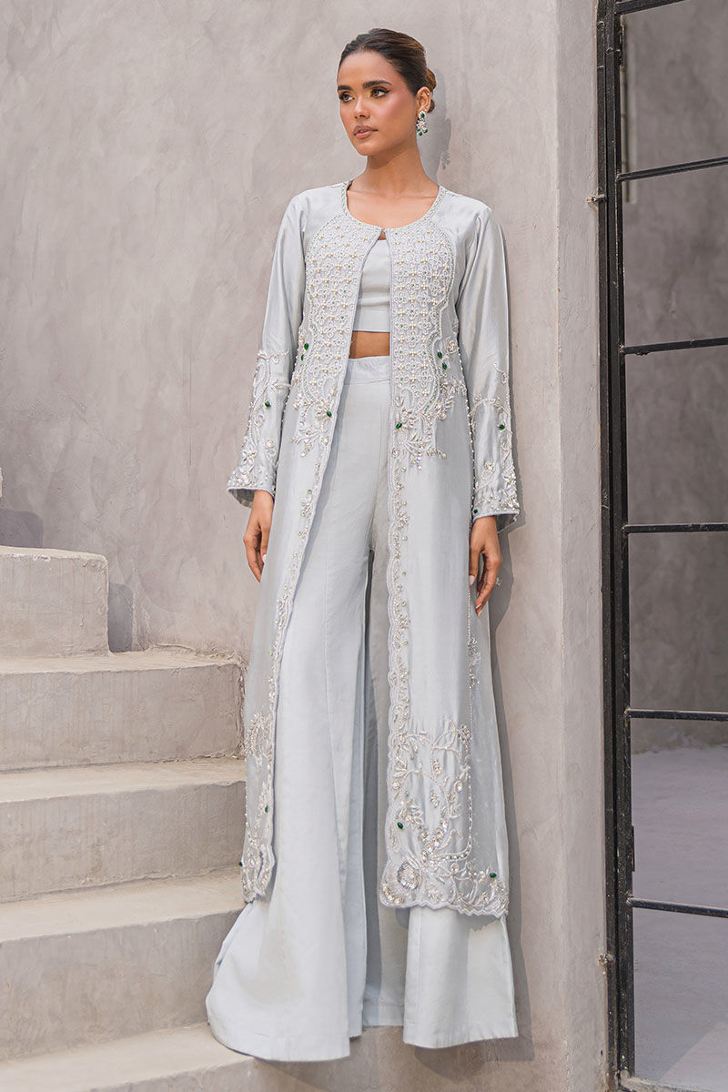 A modern ivory ensemble redefining elegance. The long open jacket is embellished with delicate handwork in silver sequins, cutdana, and thread detailing, layered gracefully over wide palazzo pants and a cropped inner blouse. Sleek, refined, and luxurious—this look is ideal for engagement parties, contemporary weddings, or sophisticated evening events.